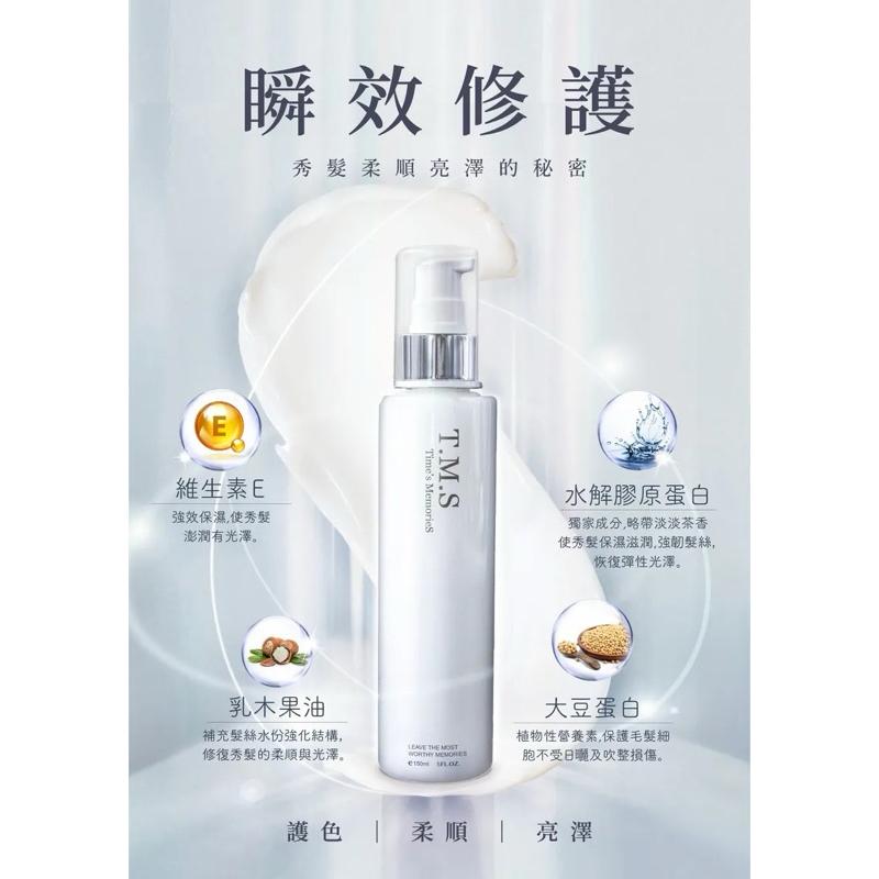 T.M.S 緹蔓思 果酸極致修護精華 150ml 三大價值 1.煥髮重生:燙後受損狀態最佳修補快速恢復美麗亮澤。 2. 抗熱預防:預防造型時來自電棒或離子夾的高溫損害。 3.日常保養:遠離毛躁,和日常分岔說掰掰。 角蛋白和水分子獨家配方結合精選迷人香氛隨時給予髮絲迷人香氣及絲滑感。 值得您在記憶中留下一次深刻回憶 ✅ 使用方式:本產品為免沖洗護髮且為乾髮濕髮都可以使用,頭髮清潔完後,擠約1~3下依照各人髮量均勻塗抹於髮中髮尾後梳順再吹乾即可。