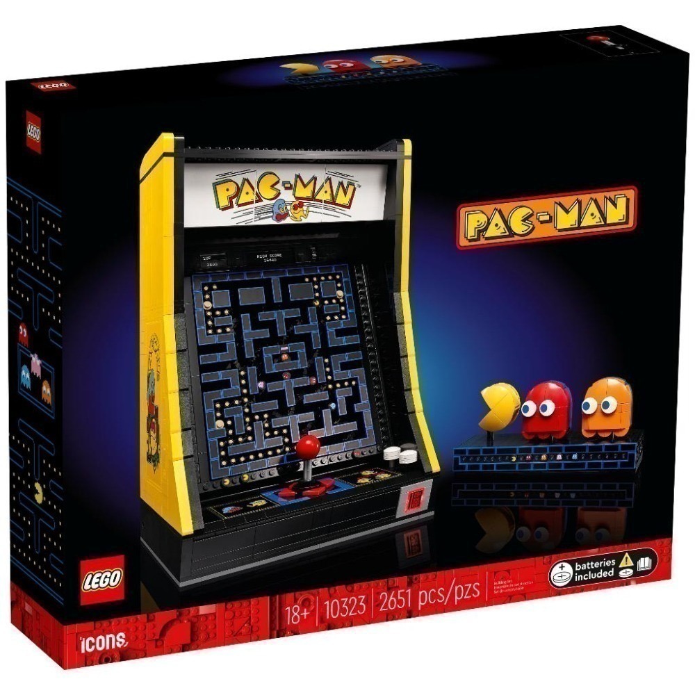 • 盒裡有什麼?-包含拼砌 PAC-MAN 機台與展示盒的所有必需品,展示盒上有可轉動的 PAC-MAN、BLINKY 和 CLYDE 玩偶,此外還有 1980 年代電子遊樂場場景與 1 隻打電動的人偶