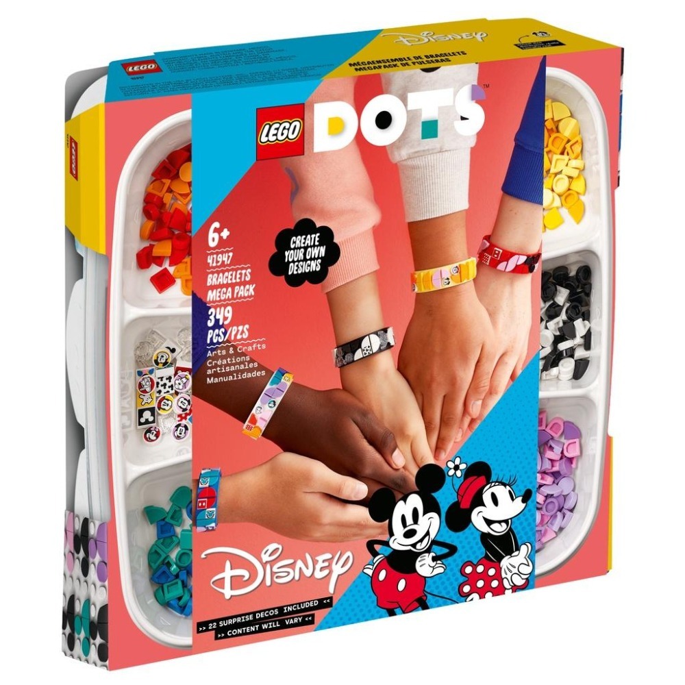 你家有 6 歲以上、喜歡藝術與手工藝,而且熱愛迪士尼米奇的孩子嗎?他們可以用這款 LEGO® DOTS 迪士尼豆豆手環超值組-Mickey & Friends(41947)滿足這兩種愛好!此盒組包含 5 條手環與多個彩色、亮片與印花豆豆,豆豆皆裝在可重複使用的專屬收納盤內。
