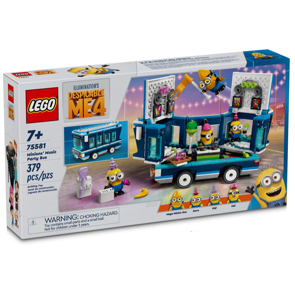 此盒組包含 4 個小小兵玩偶:菲爾、梅爾、戴夫,以及在電影《神偷奶爸 4》中首次登場的飛天 Mega Minion Gus。這輛巴士有駕駛座,車頂有適合 Gus 抓住的欄杆。巴士一側可從中間打開、車頂可掀開,露出舞池、DJ 台、電吉他、鋼琴、麥克風、燈具、喇叭和熱水浴池!多種零件皆可拆卸,讓遊戲擴展到巴士之外。這款好玩的兒童玩具有豐富的鮮豔色彩與酷炫配件,包括旗子、氣球、冰淇淋、帽子、飲料、燈具、喇叭和螢幕。孩子也可使用 LEGO Builder 應用程式享受數位樂趣。