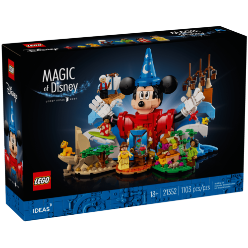 這款值得收藏的模型以身穿魔法師學徒服裝的米奇為中心,呈現了許多超人氣迪士尼角色,包含史上首款《美女與野獸》中拿著魔法玫瑰的貝兒樂高人偶。其他場景包括《木偶奇遇記》中乘著木筏的蓋比特、《星際寶貝》中衝浪的莉蘿、《獅子王》中在榮耀石上的辛巴、《魔法滿屋》中在馬瑞格之家的布魯諾、《幻想曲》中挑水的魔法掃帚,以及《小美人魚》中的螃蟹賽巴斯丁與小比目魚。