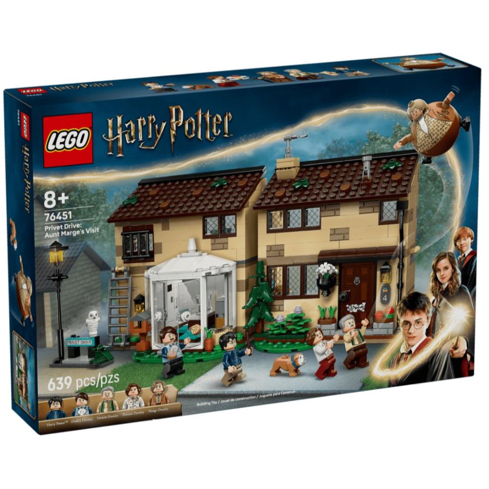 這款奇幻冒險盒組適合送給 8 歲以上男孩、女孩與粉絲,當作佳節的魔法玩具好禮或生日禮物,內有 5 隻樂高哈利波特人偶和狗狗殺手玩偶。裡面還有充氣版瑪姬姑姑玩偶,可重現哈利施咒讓她像氣球一樣充氣的爆笑場景,以及含「Privet Drive」(水蠟樹街)牌子和路燈的副模型。