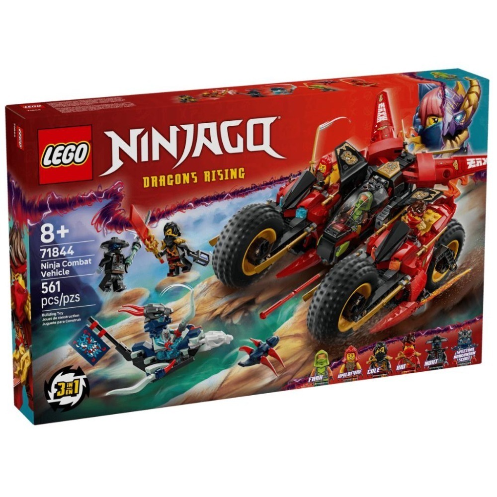 8 歲以上孩子可用忍者戰鬥車(71844)3 合 1 可動玩具重演電視影集《旋風忍者®:猛龍崛起》第 3 季的場景。孩子可暢玩大型忍者戰鬥車可動玩具,再將模型拆成 3 台小型交通工具:赤地的摩托車、野火的摩托車與弗拉克的噴射機玩具(搭載 2 支鉚釘射擊器)。