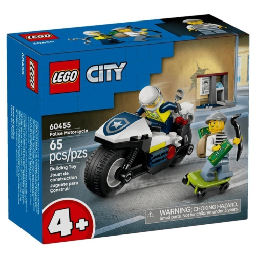 用這款精采刺激的樂高® 城市警用摩托車追逐戰(60455)盒組給你家小小動作英雄一個驚喜。此盒組非常適合 4 歲以上小小拼砌者,內有搭載寬輪胎的酷炫警用摩托車、壞蛋的逃亡滑板,以及可打開的迷你自動提款機和玩具鈔票。只要加進警官與壞蛋人偶,即可享受長時間的想像遊戲和說故事樂趣。