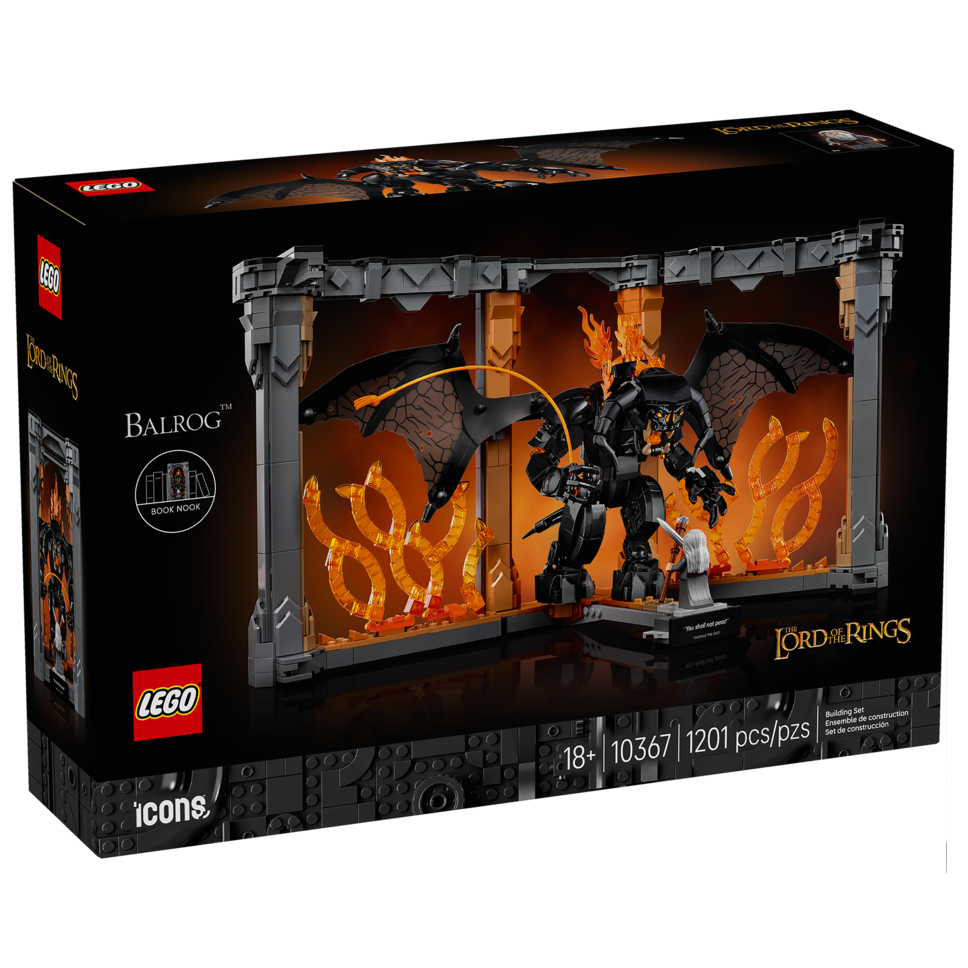 此模型包含印著「You Shall Not Pass」字樣的牌子,刻劃了無畏姿態的灰袍甘道夫™,以及在烈焰牆前展開巨大翅膀的炎魔。兩個角色皆可拆卸,甘道夫人偶配有法杖與劍,炎魔玩偶則揮舞著火鞭,並有可動四肢和翅膀,可打造動態擺飾。