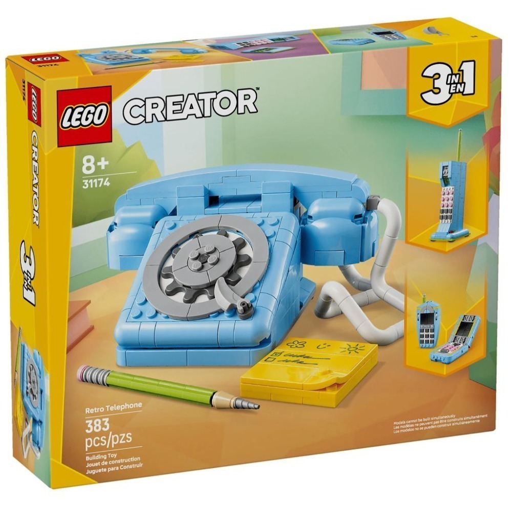 • 1 套盒組,3 種復古電話模型拼砌選擇-樂高® 創意百變系列 3 合 1 復古電話讓 8 歲以上孩子用相同積木拼砌與重新拼砌 3 種不同的復古風格模型