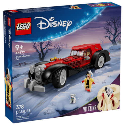 • 盒裡有什麼-此樂高® 迪士尼玩具拼砌盒組內有經典汽車拼砌模型,並配有樂高迪士尼反派角色庫伊拉,以及狗狗角色,適合遊玩或展示