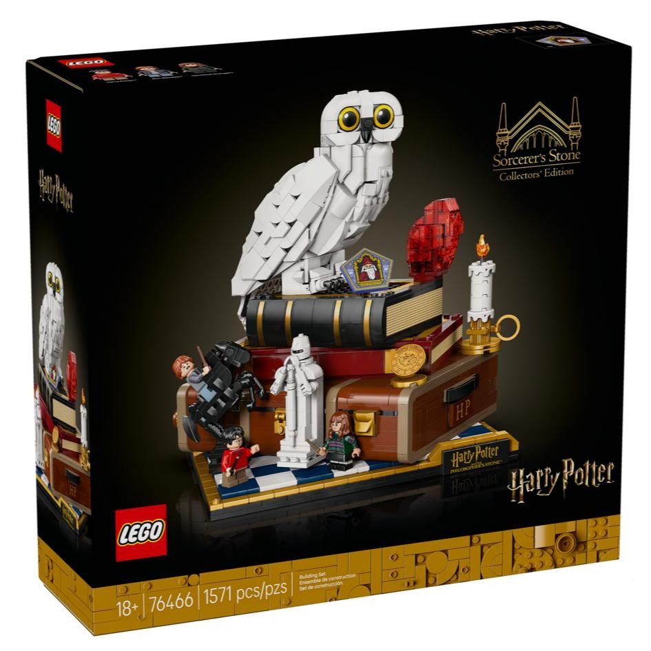 拼砌樂高® 哈利波特™ 25 週年紀念盒組:魔法石-典藏版(76466),喚起你對《哈利波特:神秘的魔法石™》的懷念。這款值得收藏的拼砌盒組是適合哈利波特大人粉絲的首選創意贈禮,具備好玩的功能、代表性十足的角色與物品,還有迷你比例版經典場景,可激發魔法故事的回憶。 製作首款收起翅膀的樂高嘿美™ 雪鴞玩偶,並將她擺在哈利波特皮箱頂端的魔法石旁邊展示。加上 3 隻樂高哈利波特人偶-哈利波特、妙麗格蘭傑™ 與榮恩衛斯理™-以及巧克力蛙畫片和巫師棋棋盤等物品。 用 3 個旋鈕轉動嘿美的頭、讓巫師棋棋盤上的皇后移動,以及打開哈利波特的皮箱側面,揭開山地山怪的浴室襲擊場景。其他迷你比例場景刻劃了霍格華茲™ 特快車,以及哈利為了找到魔法石所面臨的 5 個試煉。此盒組包含 1,571 個零件。