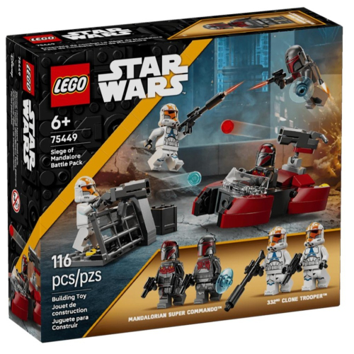 • 曼達洛玩具拼砌盒組-用這款戰鬥組(75449)上演《星際大戰:複製人之戰™》裡的曼達洛圍攻戰,讓曼達洛超級突擊兵與 332 連複製人士兵正面交鋒