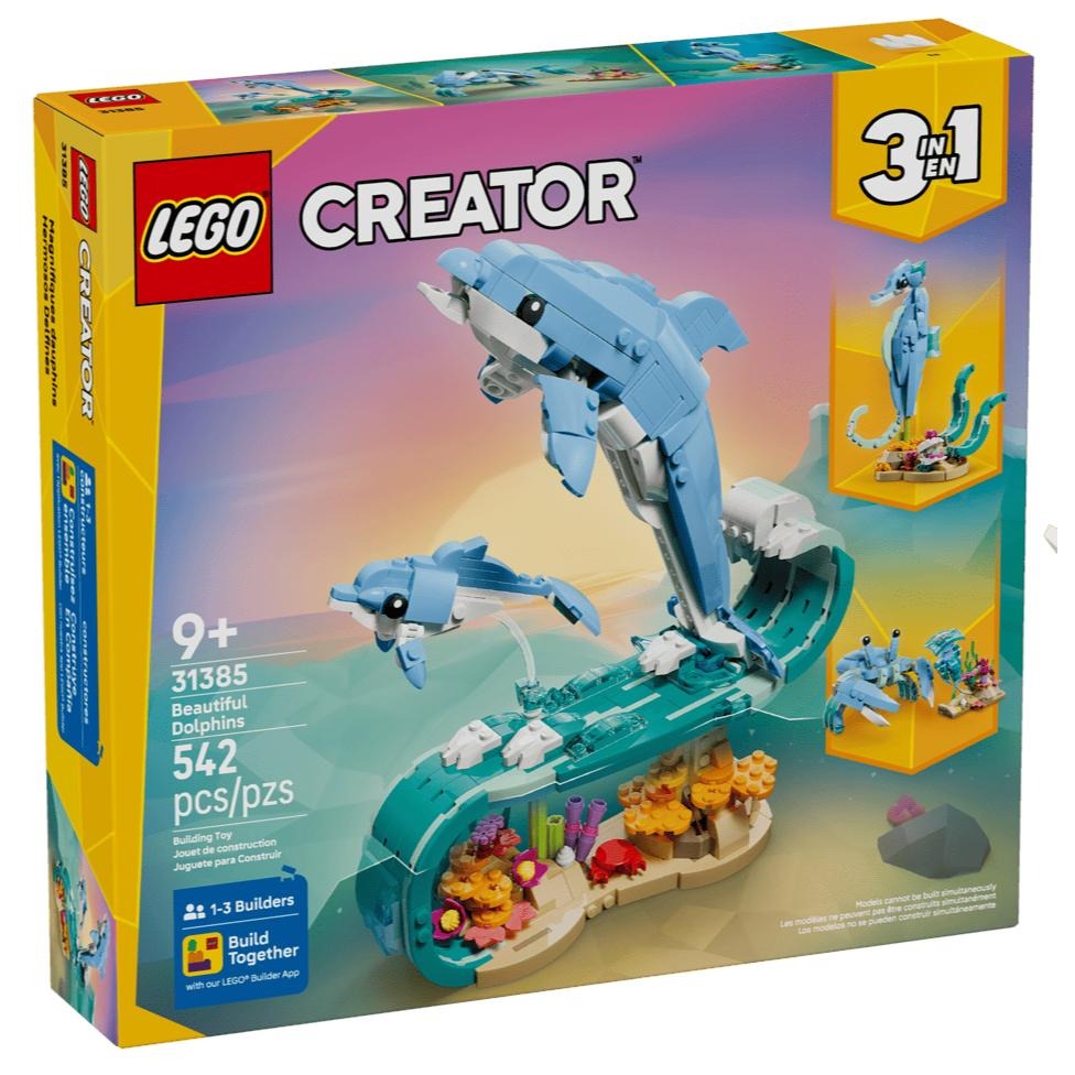 3 合 1 動物玩偶-樂高® 創意百變系列 3 合 1 海洋動物:美麗海豚(31385)拼砌玩具讓 9 歲以上女生、男生與孩子用相同積木拼砌和重新拼砌 3 種海洋玩具