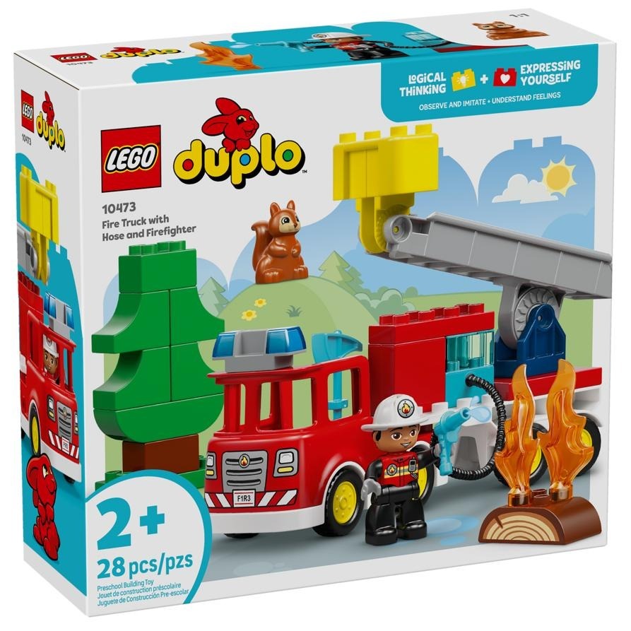 為 2 歲以上幼兒送上樂高® 得寶® 小鎮附水管消防車和消防員(10473)應急車輛玩具,激發樂趣無窮的救援扮演遊戲。此消防車玩具有豐富的特色,如可彎曲的水管、樹,還有樂高得寶松鼠玩偶。