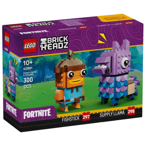 • 2 個《FORTNITE®》角色玩偶-此拼砌組合包含藍/紫雙色的 BrickHeadz™ 補給駱馬玩偶,以及附十字鎬配件的橘色 BrickHeadz™ 魚柳玩偶