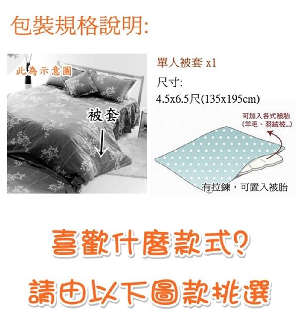 單人鋪棉兩用被套4.5x6.5尺±5% (135寬 x195長cm) x1