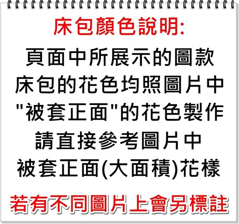 床包花色為圖片中被套正面花色,如有不同圖片上會特別標註