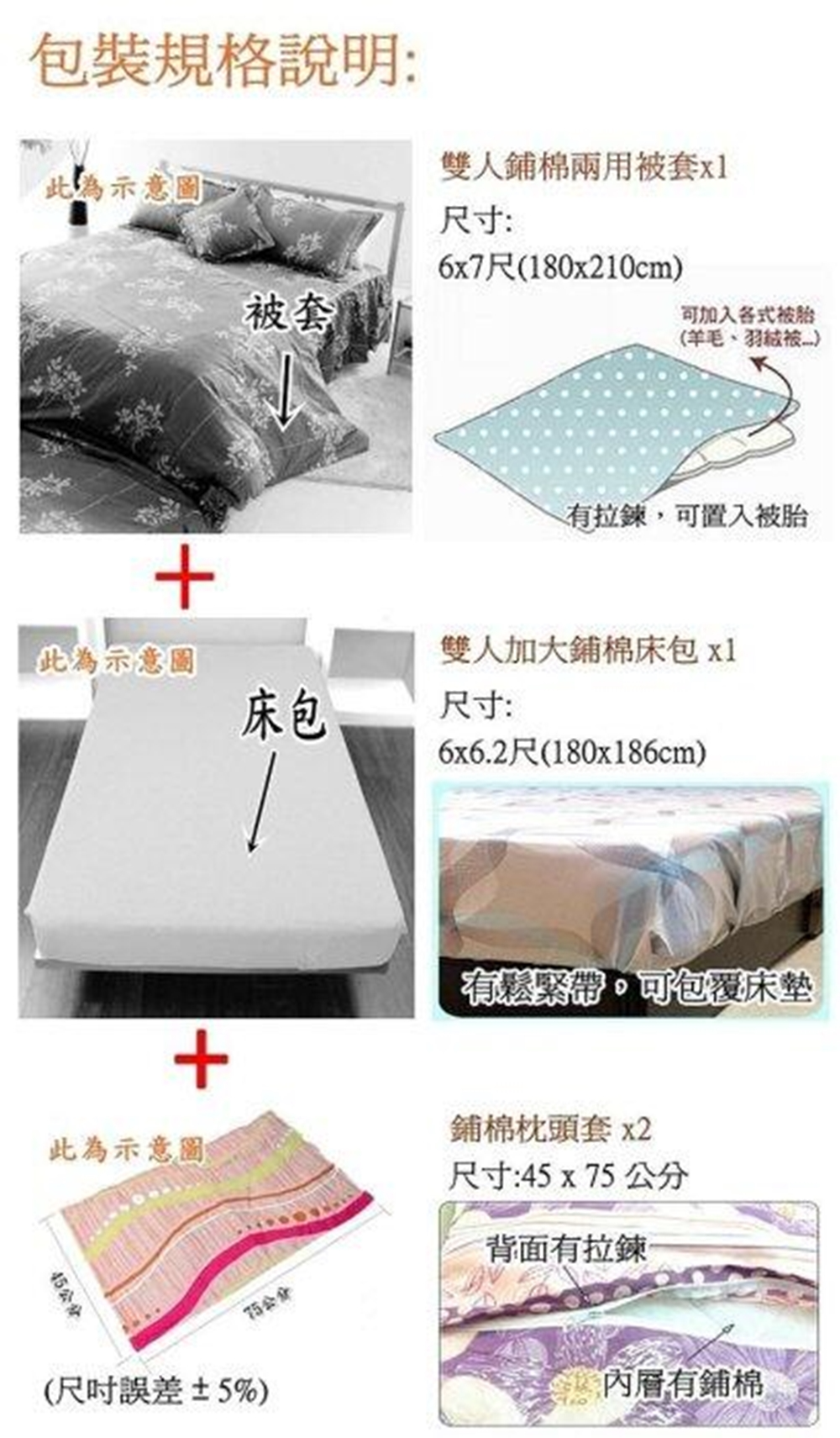 被套為鋪棉兩用被套(有拉鍊),夏天可當涼被使用,冬天可再置入被胎