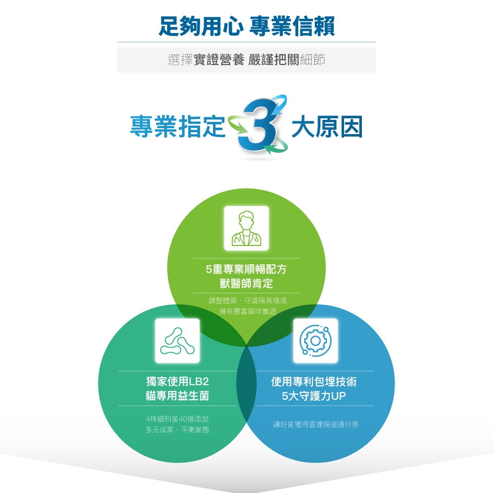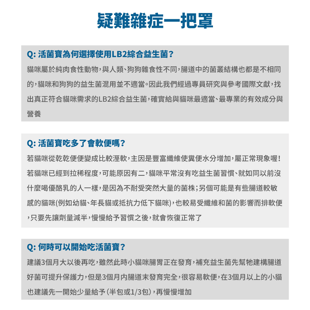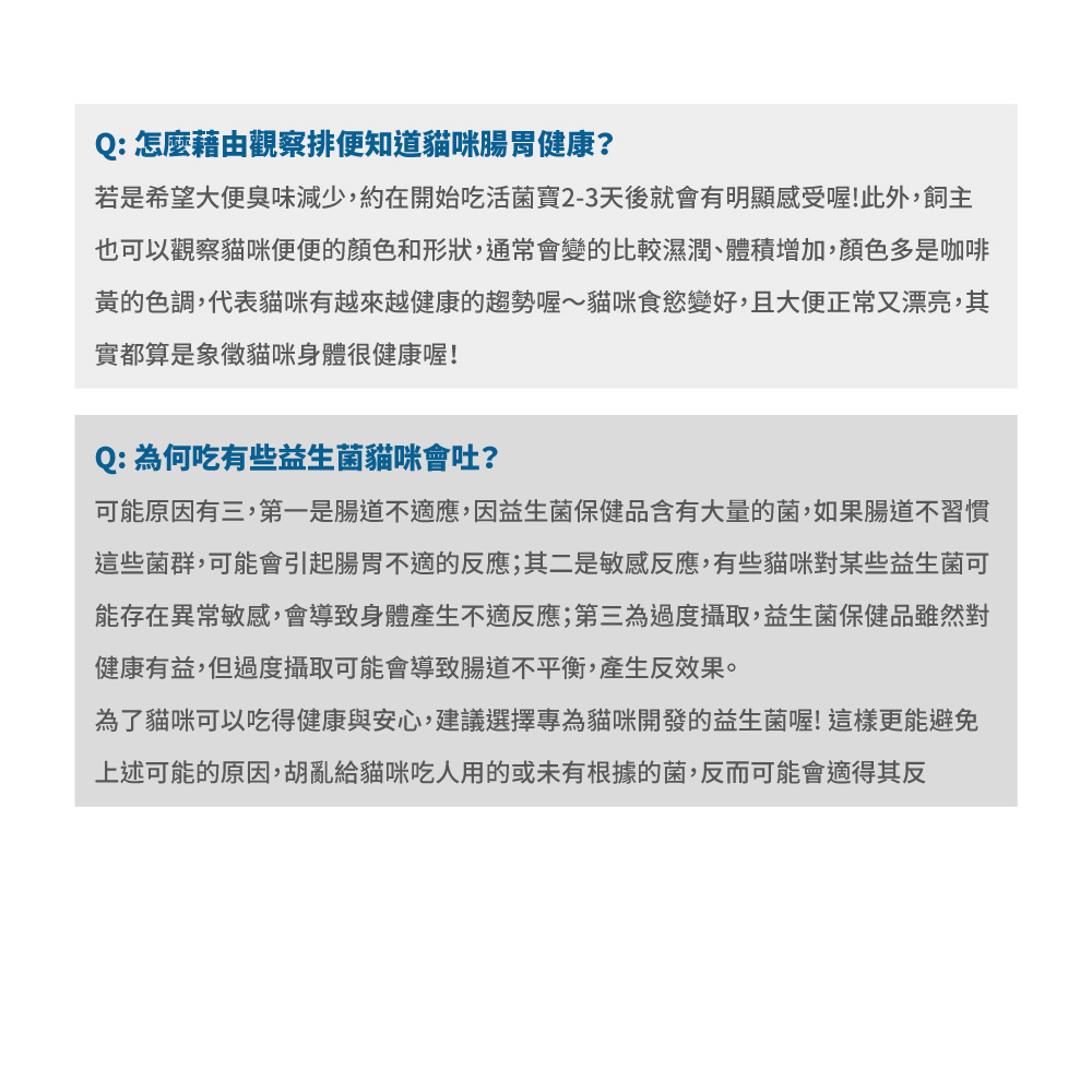 A:貓咪屬於純肉食性動物,與人類、狗狗雜食性不同,腸道中的菌叢結構也都是不相同的,貓咪和狗狗的益生菌混用並不適當。因此我們經過專員研究與參考國際文獻,找出真正符合貓咪需求的LB2綜合益生菌,確實給與貓咪最適當、最專業的有效成分與營養