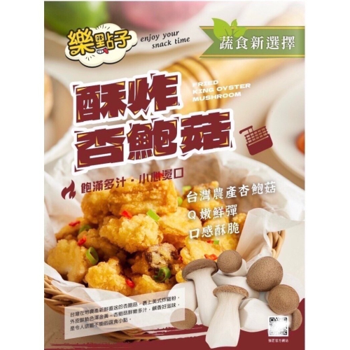 嚴選台灣在地農產新鮮直送的杏鮑菇,裹上美式炸雞粉,外皮酥脆色澤金黃,杏鮑菇鮮嫩多汁,鹹香好滋味,簡單料理,即刻就能享有令人欲罷不能的蔬食小點