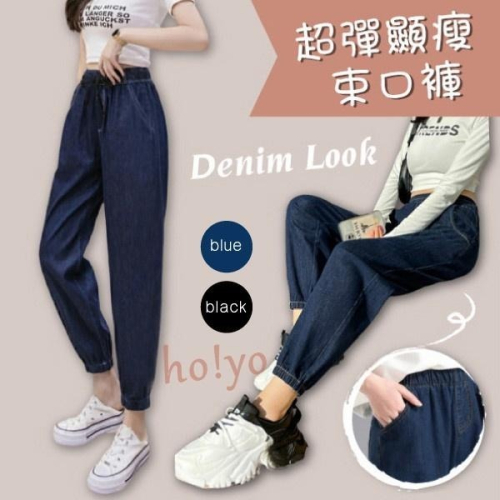 高腰鬆緊牛仔束口褲 中大尺碼 牛仔長褲 縮口褲 牛仔褲 工作褲 休閒褲 寬鬆顯瘦 長褲 老爹褲 哈倫褲 休閒長褲街頭穿搭