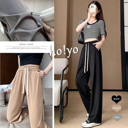 韓系🇹🇼 高質感顯瘦口袋螺紋涼感垂墜寬褲 直筒褲 高腰垂感寬鬆 闊腿褲 褲子 長褲 休閒褲 女裝 高腰褲 直筒褲