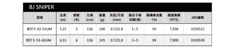 製竿技術,能提升竿身結構並提升力量的X45,使竿節接合處能達到理想的弧度並提升力量、感度的V-JOINT,再加上竿身素材使用HVF與東麗公司的NANOPLUS等兩項技術相結合,開發出以下專為肉粽場開發的BJ SNIPER 前打ち 43-53UM與能對應高低落差大的釣場BJ SNIPER 前打ち 53-63UM
