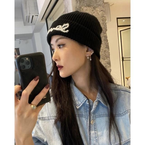 ʀᴏᴀɴɴᴀ_ᴋʀ「誰說針織帽只能冬天戴」孫芸芸同款✨無可挑剔完美頭型黑底白色草寫珍珠喀什米爾針織毛帽凹造型