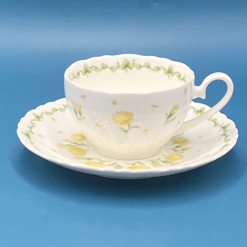 本款日本Hoya保谷骨瓷杯組,在白色的杯體及碟面上繪以黃色的蒲公英小花朵,看起來既清新又欣欣向榮!