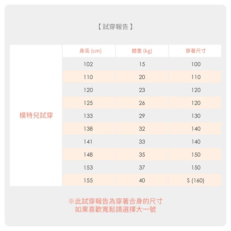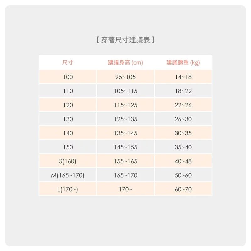 | 尺寸(cm) | 100 | 110 | 120 | 130 | 140 | 150 | 160(S) |