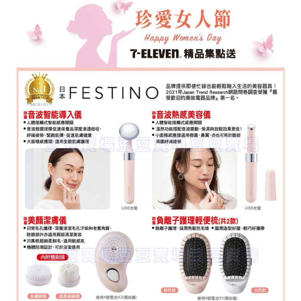 7-11 珍愛女人節 音波智能導入儀 美顔潔膚儀 音波熱感美容儀 負離子護理輕便梳 品牌提供即使忙碌也能輕鬆融入生活的美容器具! 2021年Japan Trend Research網路問卷調查榮獲『最受歡迎的美妝電器品牌』第一名。 音波智能導入儀 人體接觸式智能感應開關 音波微震按摩促進保養品深度滲透吸收 紓緩疲勞,緊緻肌彈,促進肌膚健康 大面積感應頭,適用全臉肌膚護理 美顔潔膚儀 日常毛孔護理,深層清潔毛孔汙垢和老舊角質,除臉部外亦適用肩部清潔美容 20萬根超細柔刷毛,適用敏感肌 機體防潮設計,可於浴室使用 內附雙刷頭 音波熱感美容儀 人體智能接觸式感應開關 溫熱功能搭配音波震動,保濕與放鬆效果更佳! 小面積感應頭適用唇圍、鼻翼,亦也可用於眼部 周圍紓減疲勞 負離子護理輕便梳 負離子護理,滋潤秀髮抗毛燥 圓潤造型好握、輕巧好攜帶 粉色款 白色款