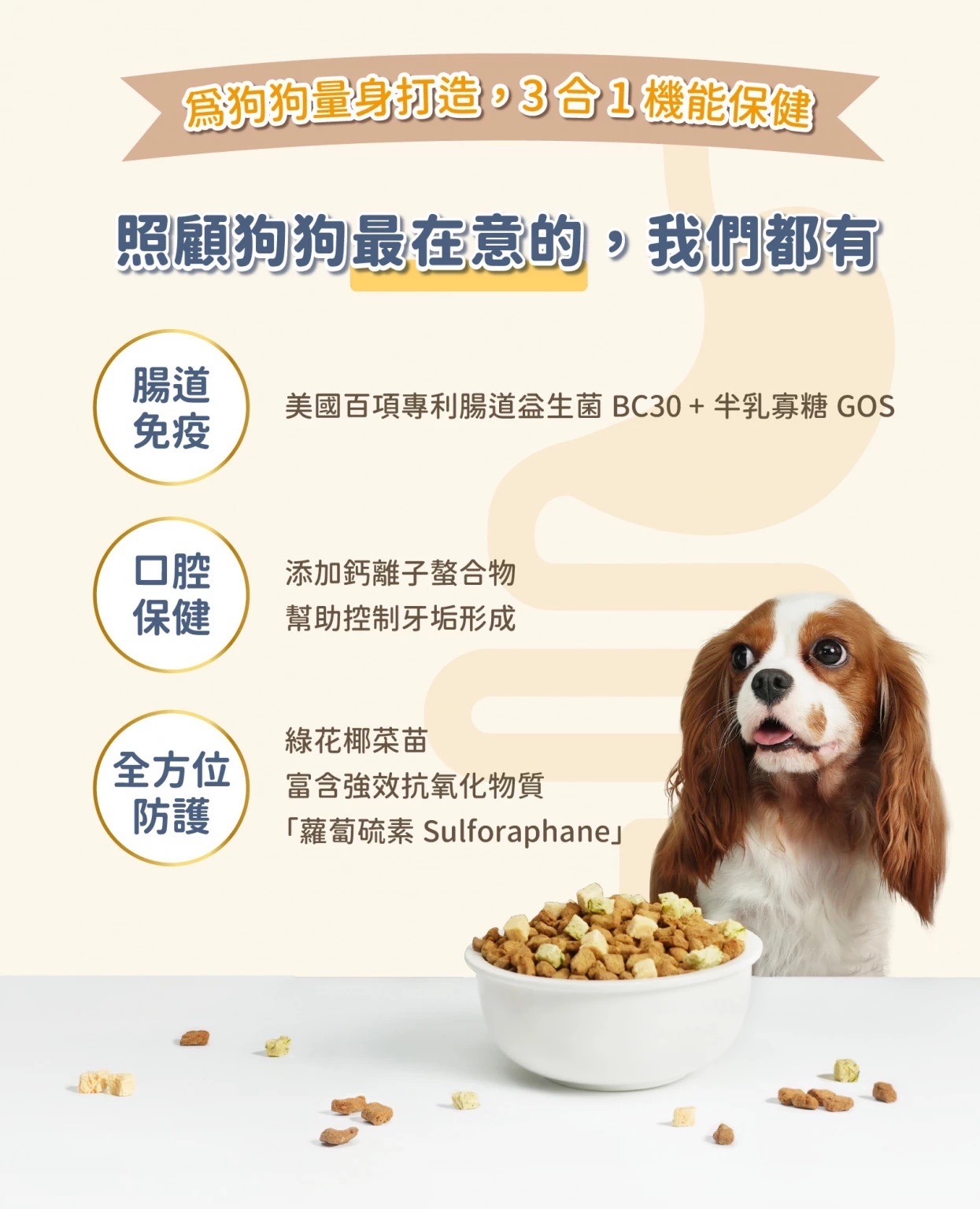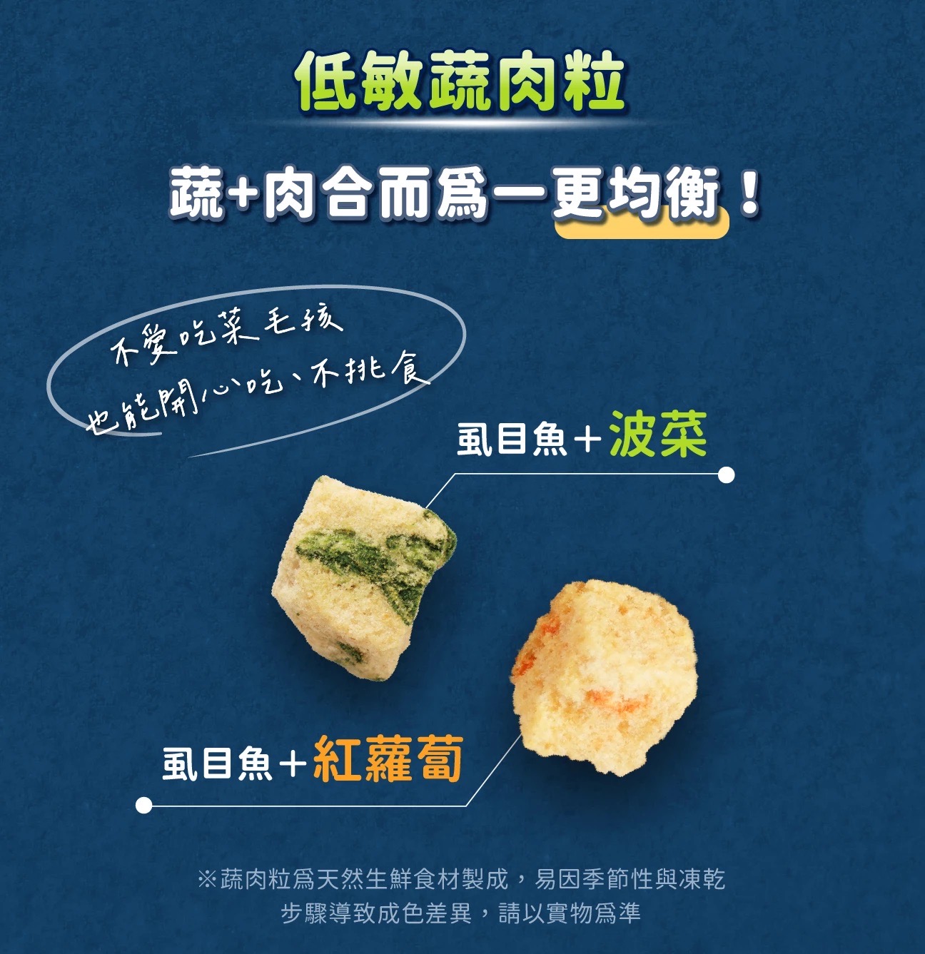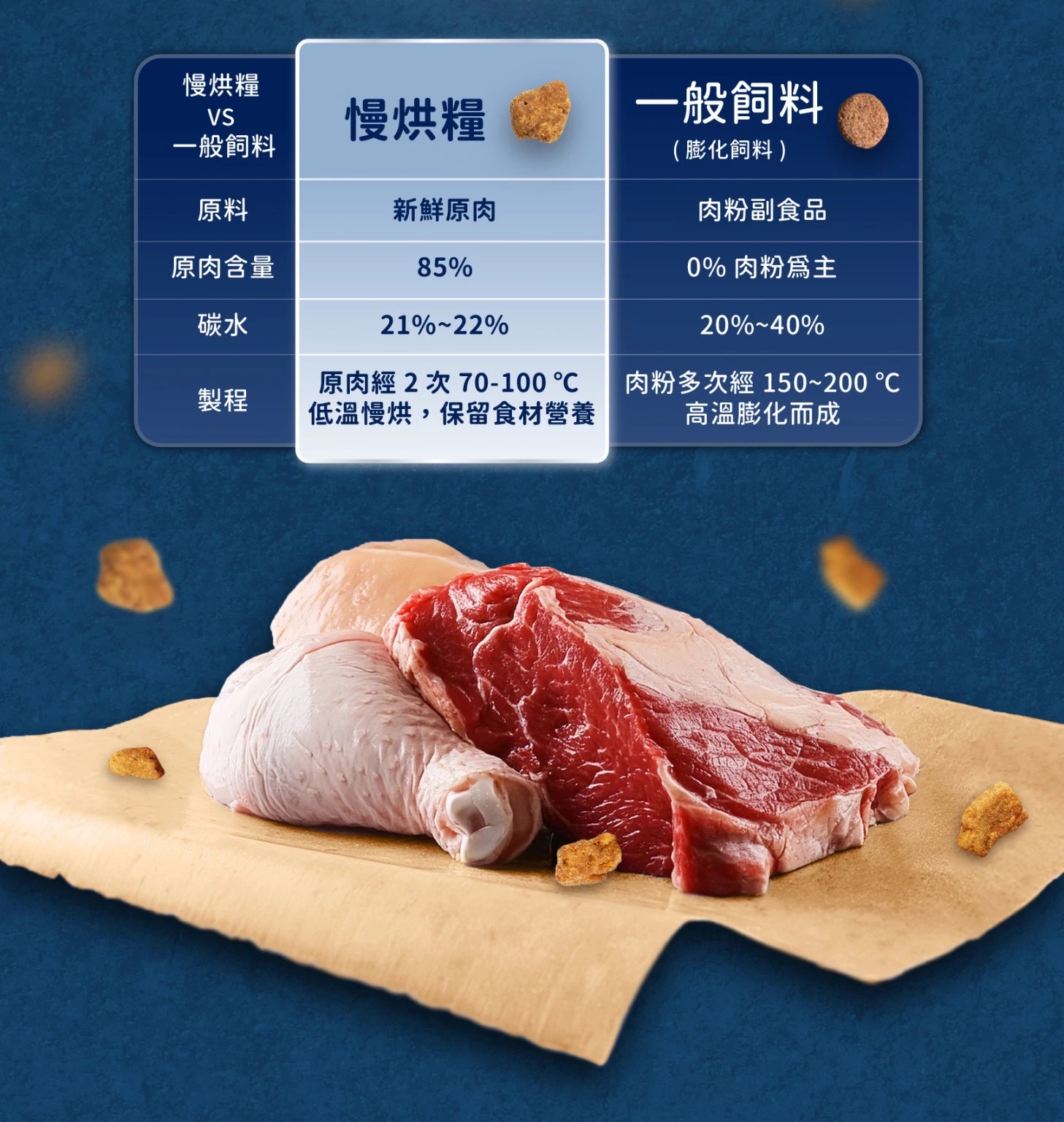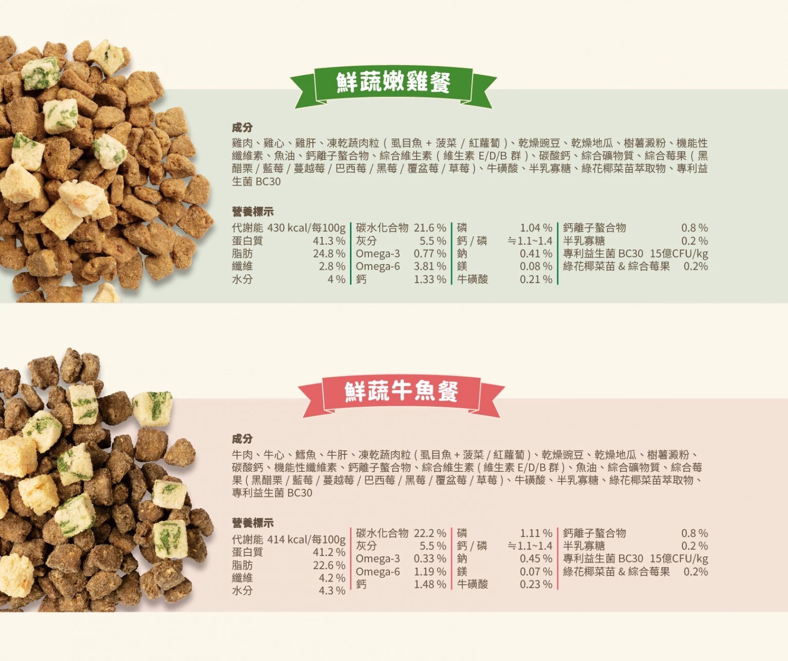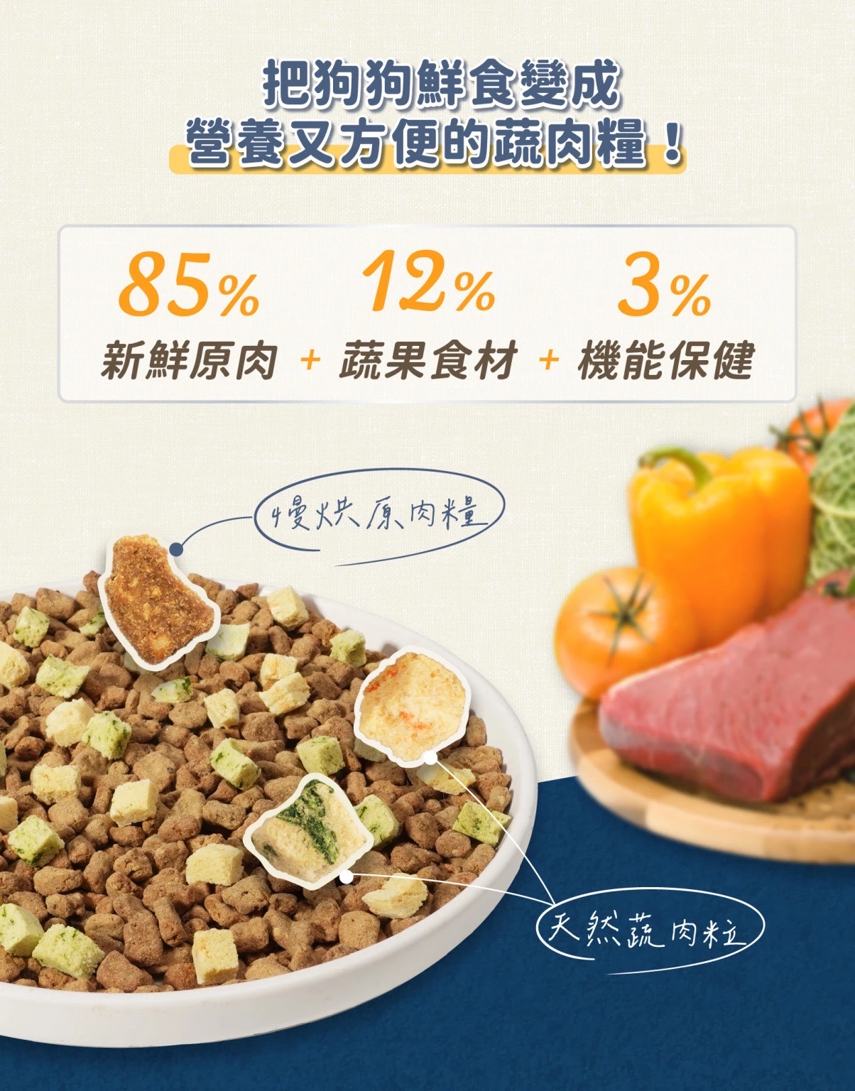 • 慢烘原肉糧+凍乾蔬肉粒,肉菜機能一次滿足!