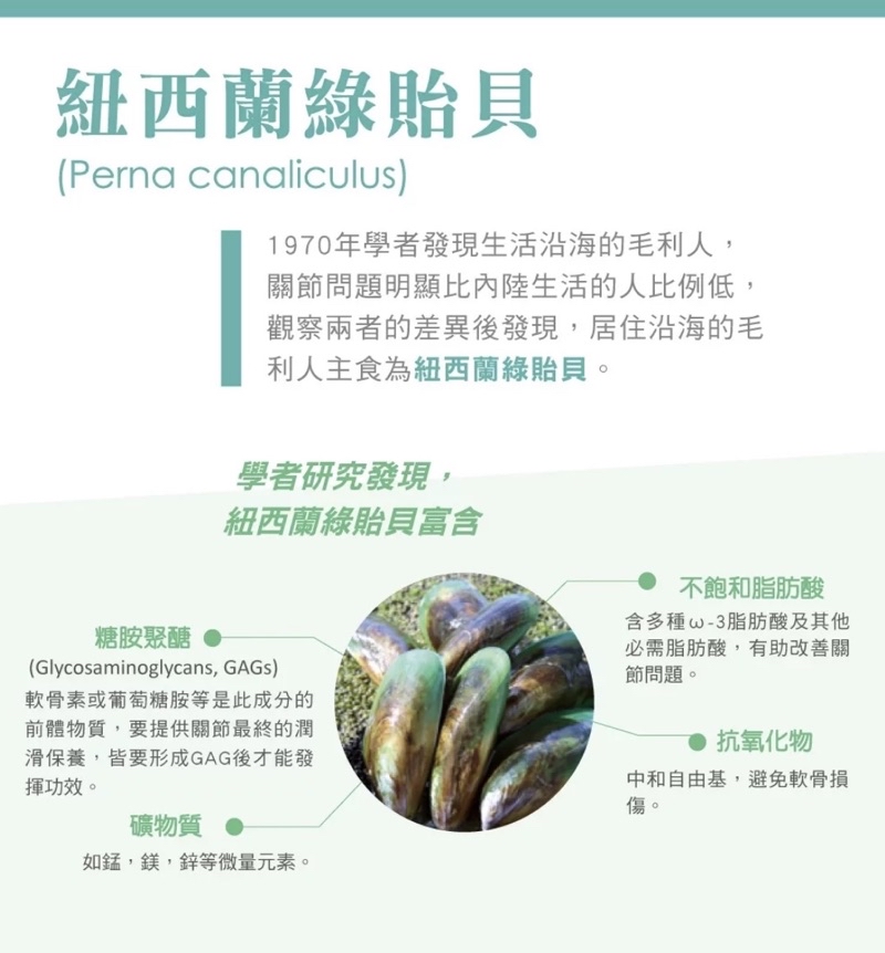主要成分:紐西蘭綠貽貝脂質萃取物、魚油omega-3、、維他命E 產品用途:利用多種脂肪酸提供關節、心血管、皮膚營養保健比錠劑多了魚油配方