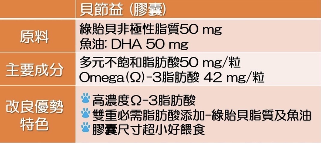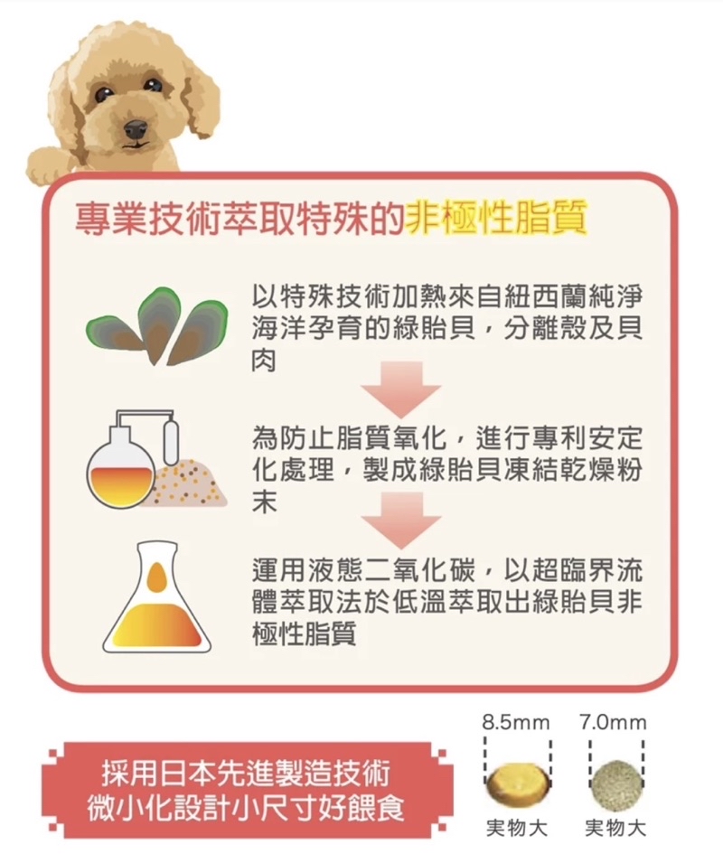 主要成分:紐西蘭綠貽貝脂質萃取物、雞肉風味劑、酵母萃取物