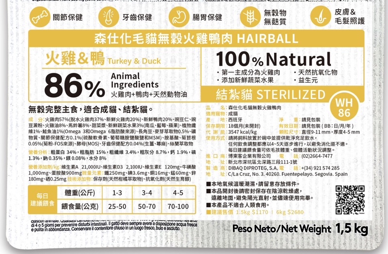 • WH86化毛貓無穀1.5kg-火雞鴨肉 WH86化毛貓無穀1.5kg-火雞鴨肉