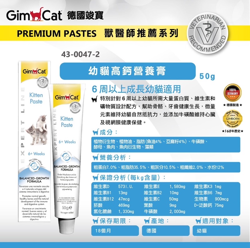 使用說明:6周以上開始餵食固體食物的幼貓,每天6cm(1cm約0.5g),可直接餵食或混入食物中。