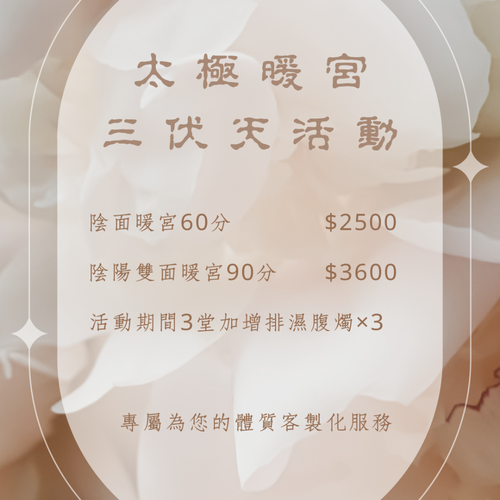 就是把握這三伏天,來享受 #暖宮療癒,一方面搭配特調精油按摩,一方面使用古老手技,太極導氣,陰陽排寒,來呵護自己的身體,調養體質☀️