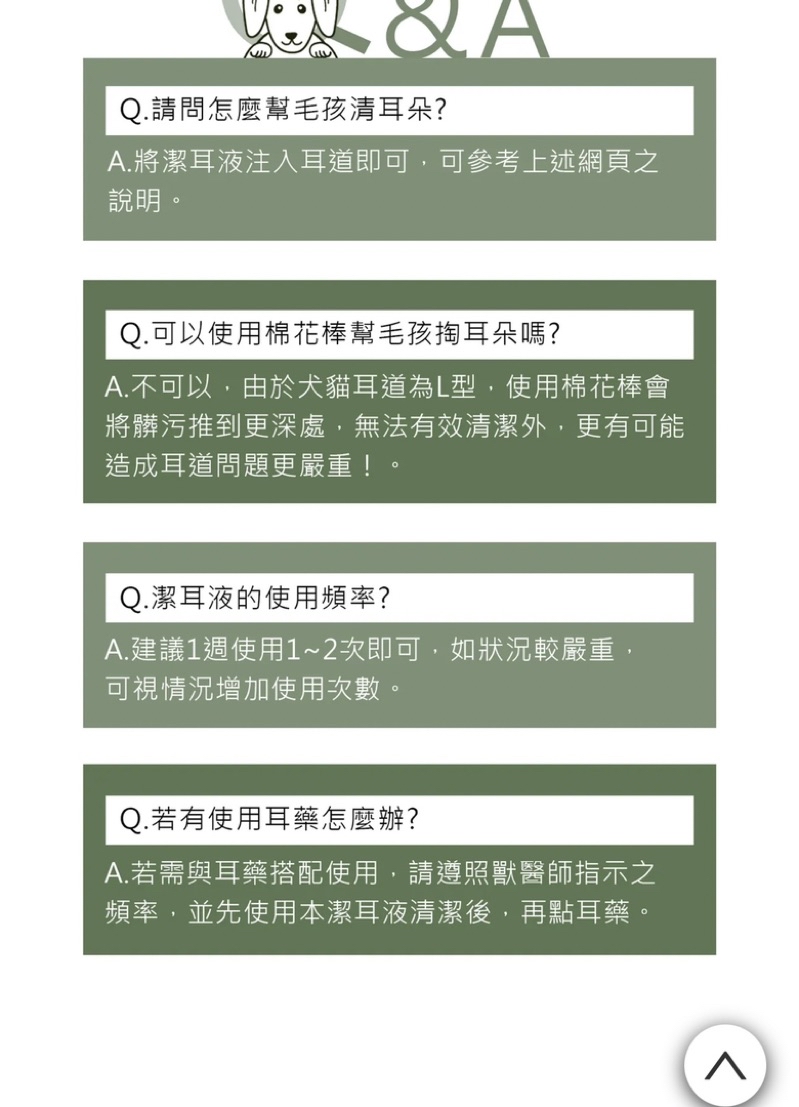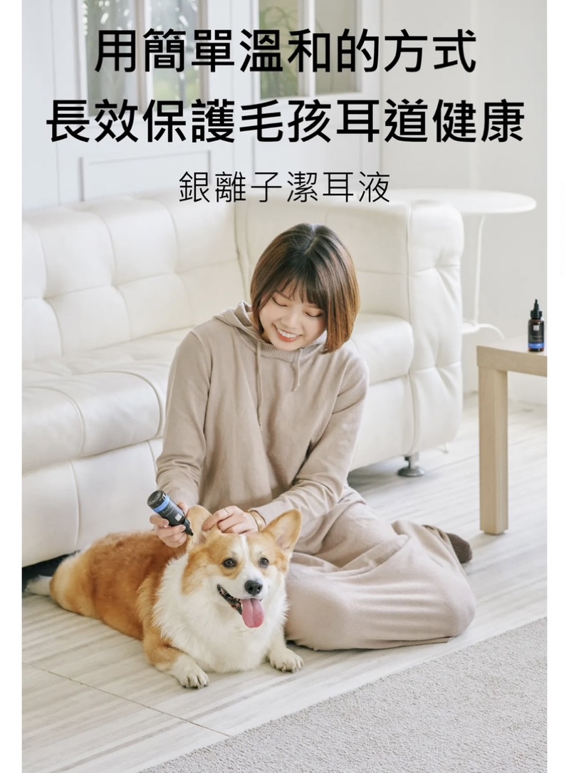 『銀離子潔耳液』是專為狗貓L型耳道清潔所推出的水狀配方,可以快速溶解耳垢,質地清爽不黏膩不殘留。