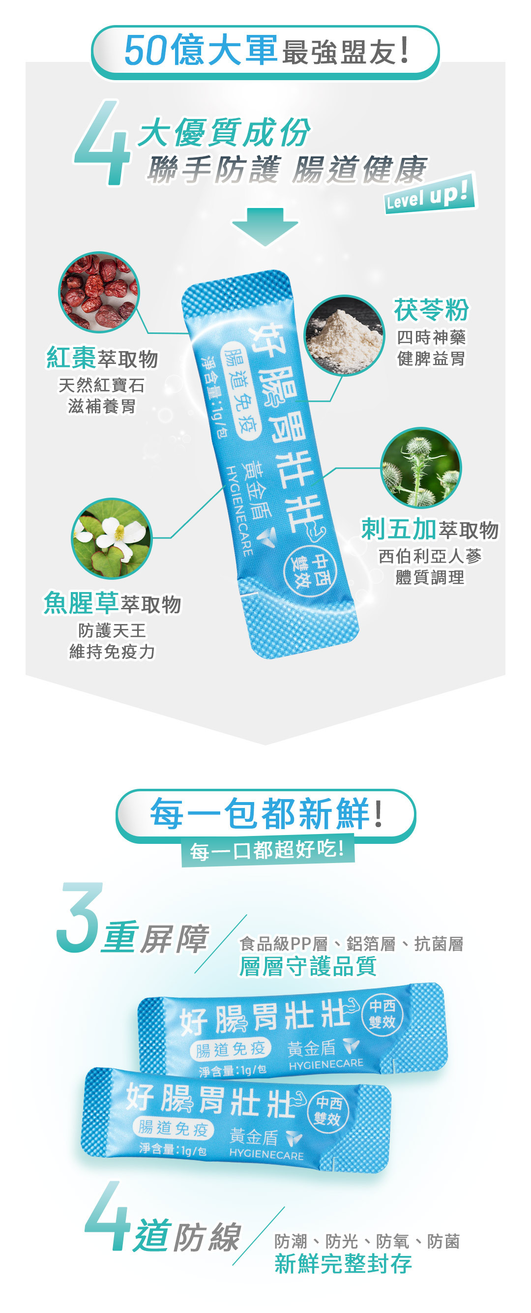 >益生元又稱益菌元、益菌生,是益生菌的營養食物,能為益生菌提供能量,「好腸胃壯壯」添加果寡糖(FOS),幫助好菌成長、壞菌減少,讓腸道菌叢維持健康平衡。