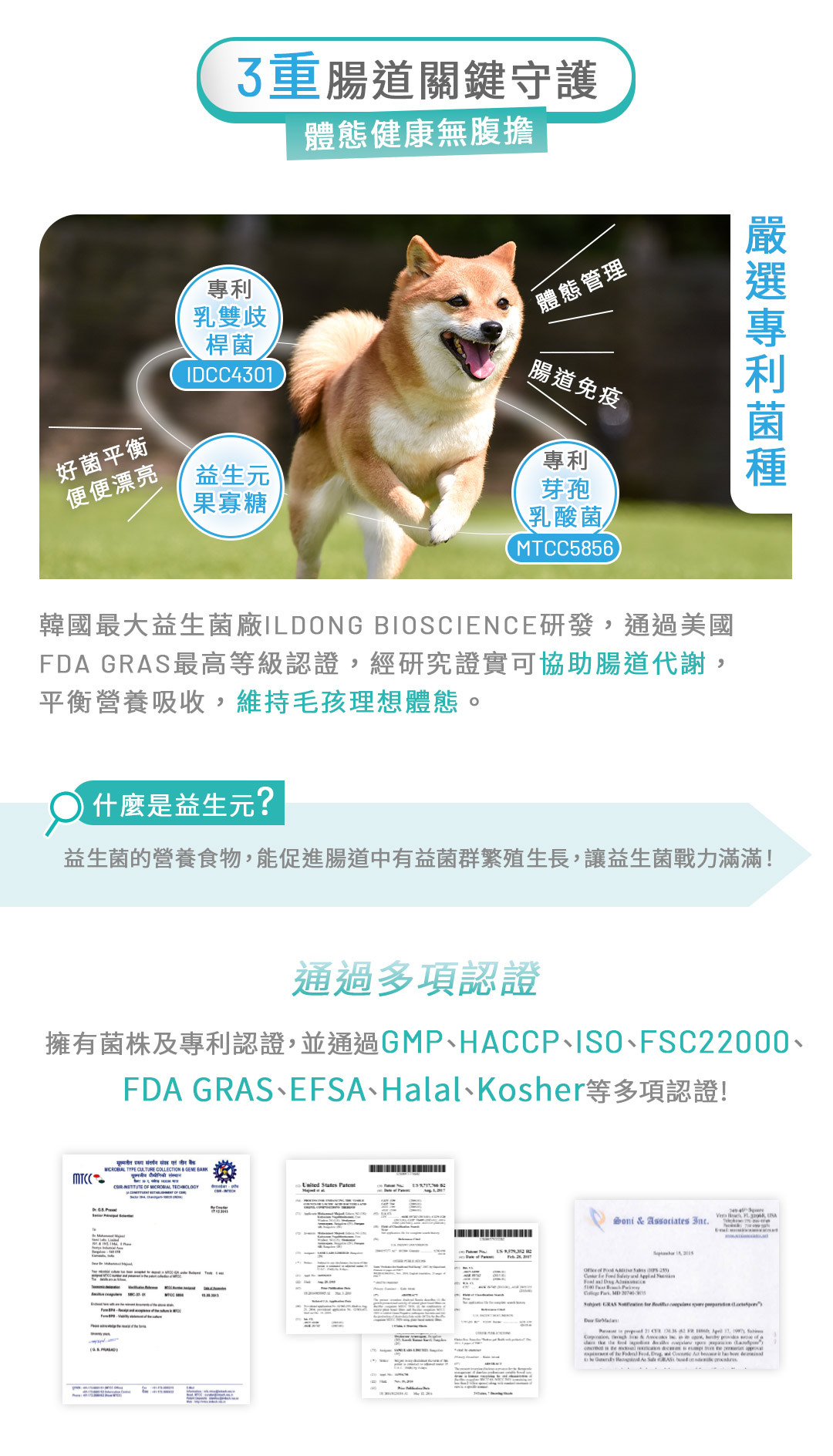 >選用來自韓國最大益生菌廠ILDONG BIOSCIENCE研發的專利乳雙歧桿菌IDCC4301,獲得美國 FDA的GRAS(Generally Recognized As Safe)認證,且具備多項臨床實證的健康效益,特別是體態管理與腸道健康,能幫助維持寵物理想體態,搭配四層益生菌包埋技術,耐胃酸及膽鹼酸,提高存活率,確保益生菌能有效抵達腸道發揮作用,真正做到有感補充!