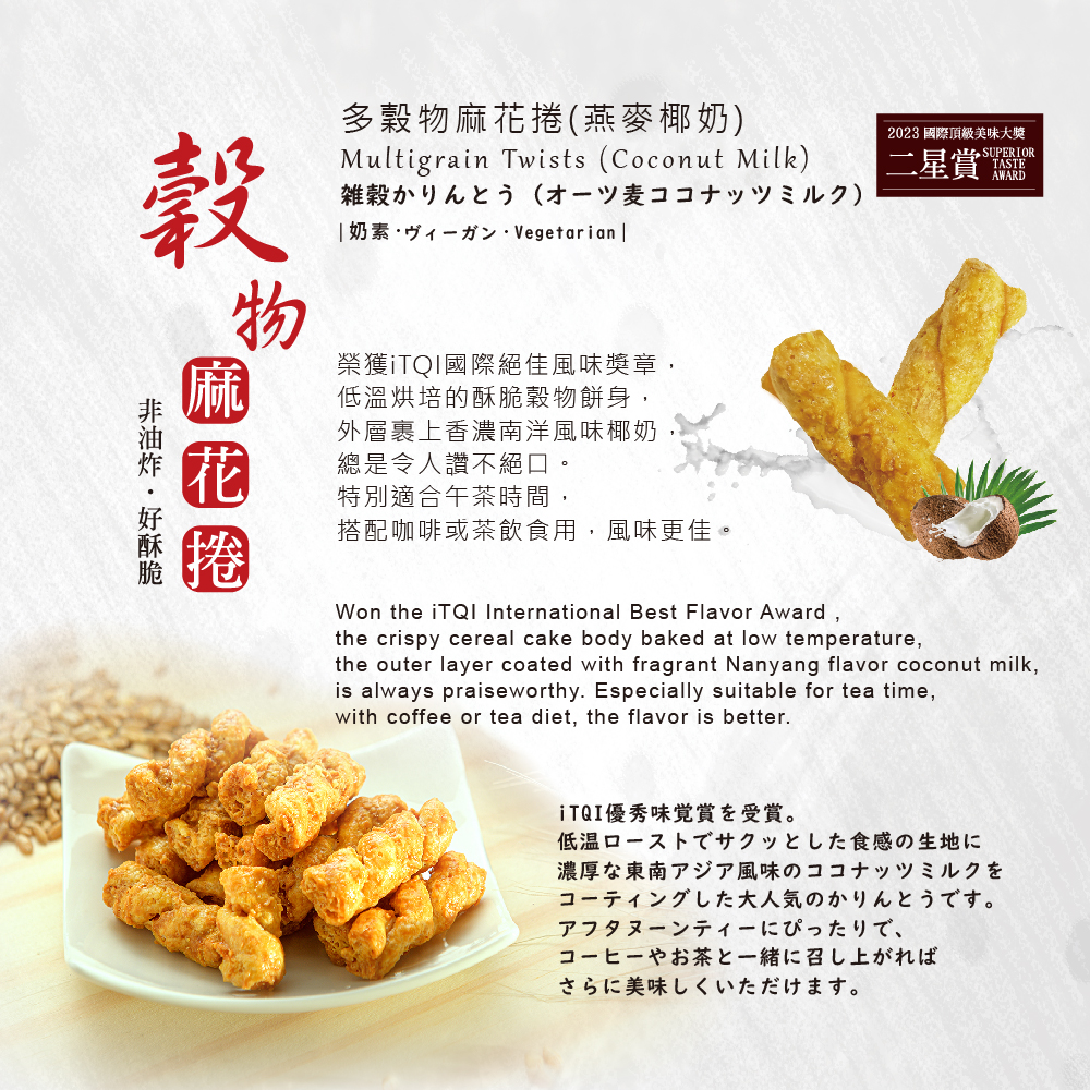 Won the iTQI International Best Flavor Award “2 Star”, the crispy cereal cake body baked at low temperature, the outer layer coated with fragrant Nanyang flavor coconut milk, is always praiseworthy. Especially suitable for tea time, with coffee or tea diet, the flavor is better.