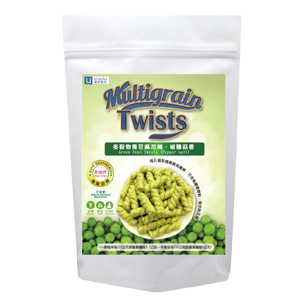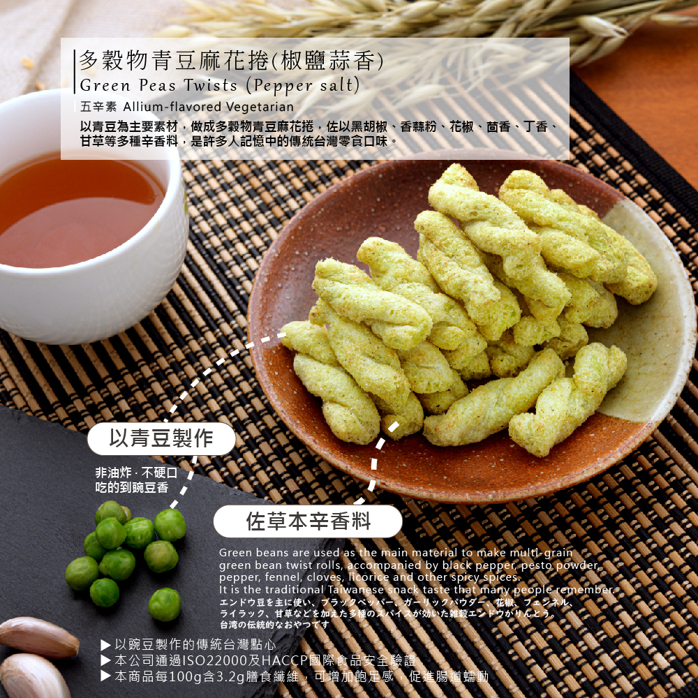 以青豆為主要素材,做成多穀物青豆麻花捲,