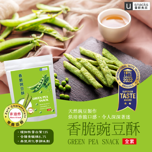 以豌豆為主要素材,製作成軟硬適中的酥脆口感,