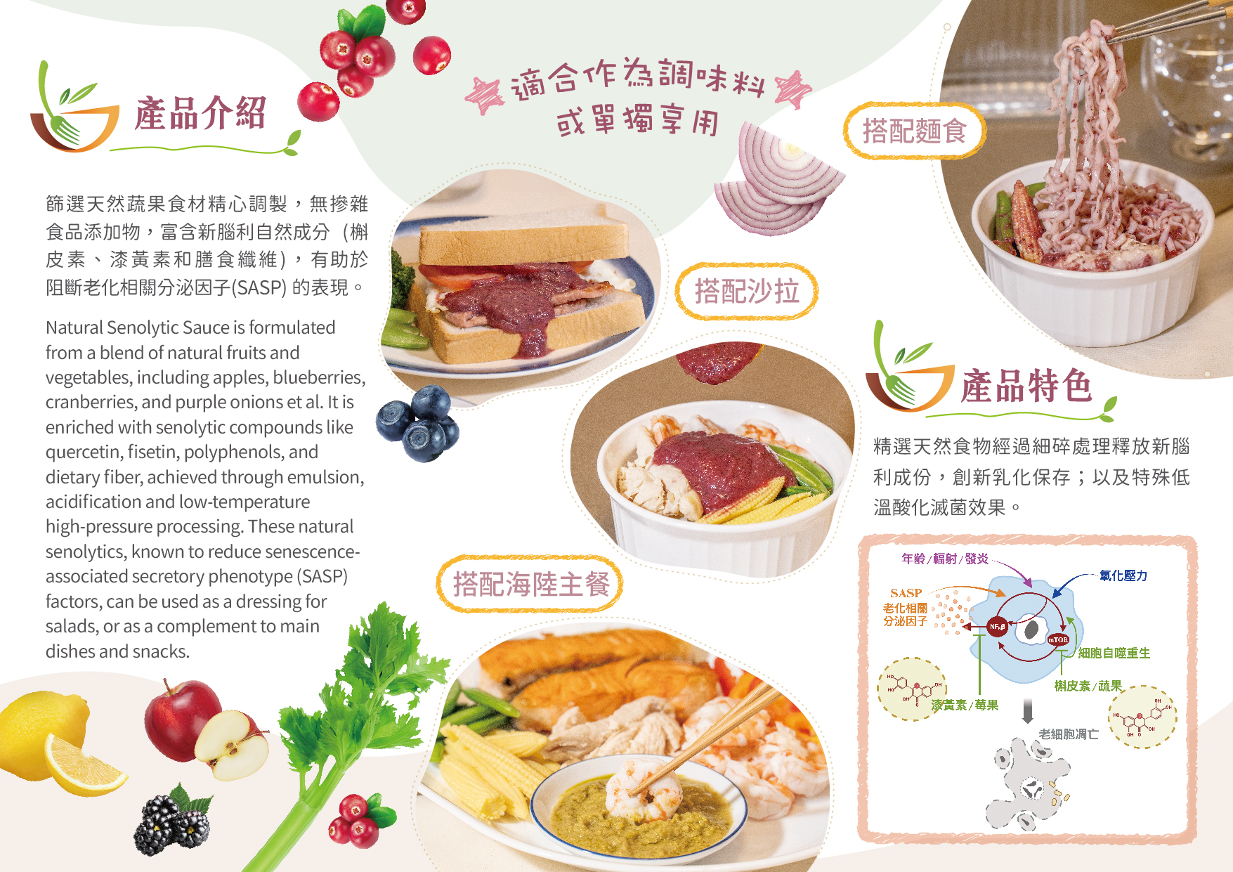 •Senolytics 科技:在SASP(老化相關因子)路徑,幫助清除衰老細胞訊號。