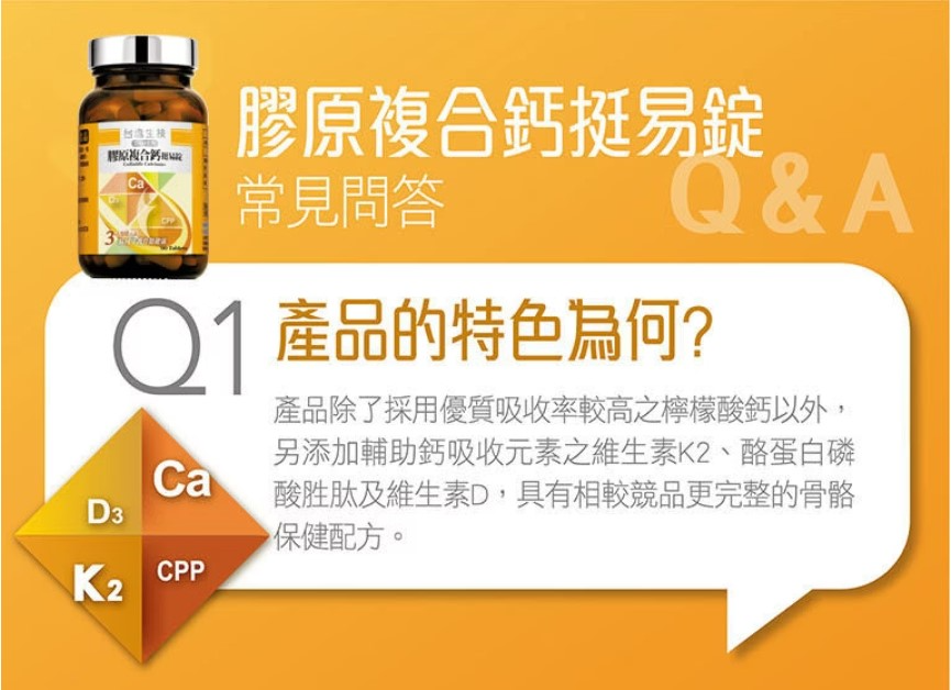 以保有活性結構的Ⅱ型膠原蛋白做為基底,搭配納豆菌發酵物及酪蛋白磷酸胜肽(CPP)彼此協同守護身體的健康;另特別添加檸檬酸鈣、磷酸鈣結合維生素D3增進鈣質吸收,是身體保健的優質產品。