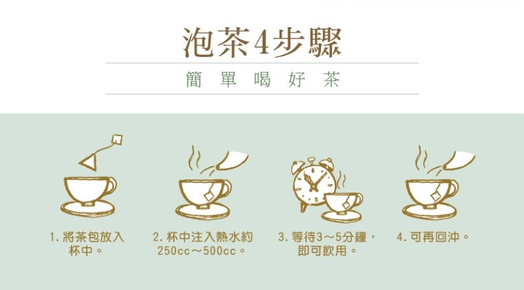 | 熱泡 | 取一茶包,沖入 250~500ml 熱開水(約 90°C),靜置 3-5 分鐘即可。 | 茶香濃郁,溫暖身心,可依個人喜好回沖 2-3 次。 |