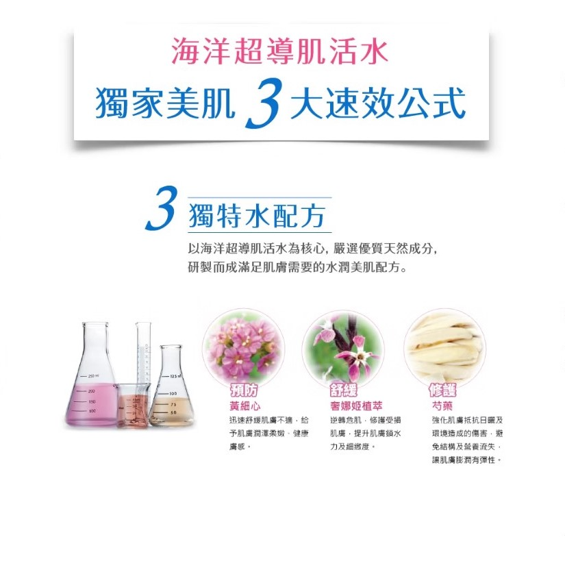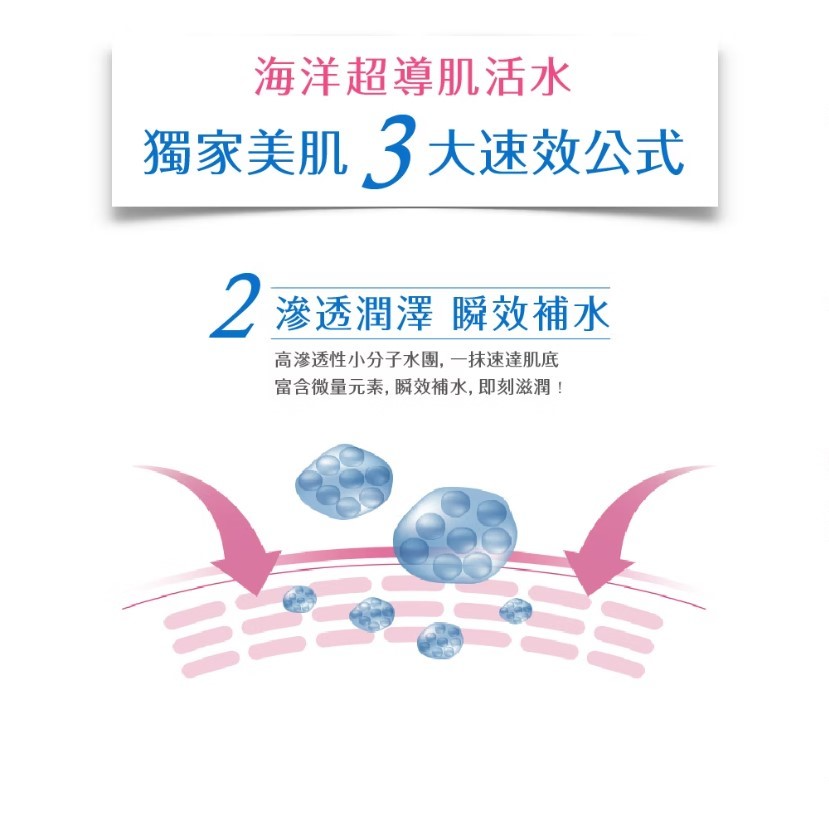 | 肌荒:換季乾燥,細紋、暗沉全都找上門。 | 水潤:海洋深層水基底,肌膚飽水澎潤有彈性。 |