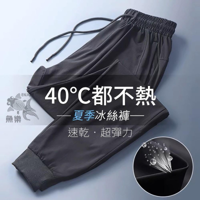 【小魚生活館台灣現貨】男生夏季冰絲束口九分褲 降溫褲 縮口休閒褲