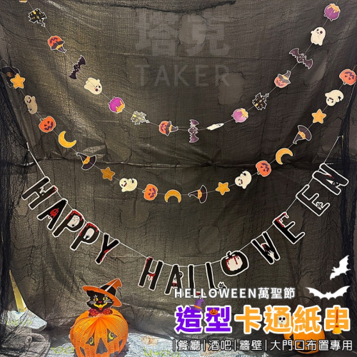 | 商品特色 | ■名稱:萬聖卡通紙串 ■說明: ●萬聖節應景造型 ●全長約2公尺 (200cm),可自行排列 ●附掛繩、可搭配其他商品一同布置 ●可掛天花板或者當門簾串 |