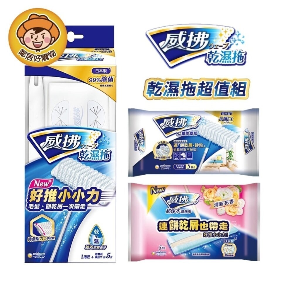 ●威拂 乾濕拖超值組-內容物:乾溼拖1把+立體除塵紙5片+濕拖巾清新花香5片