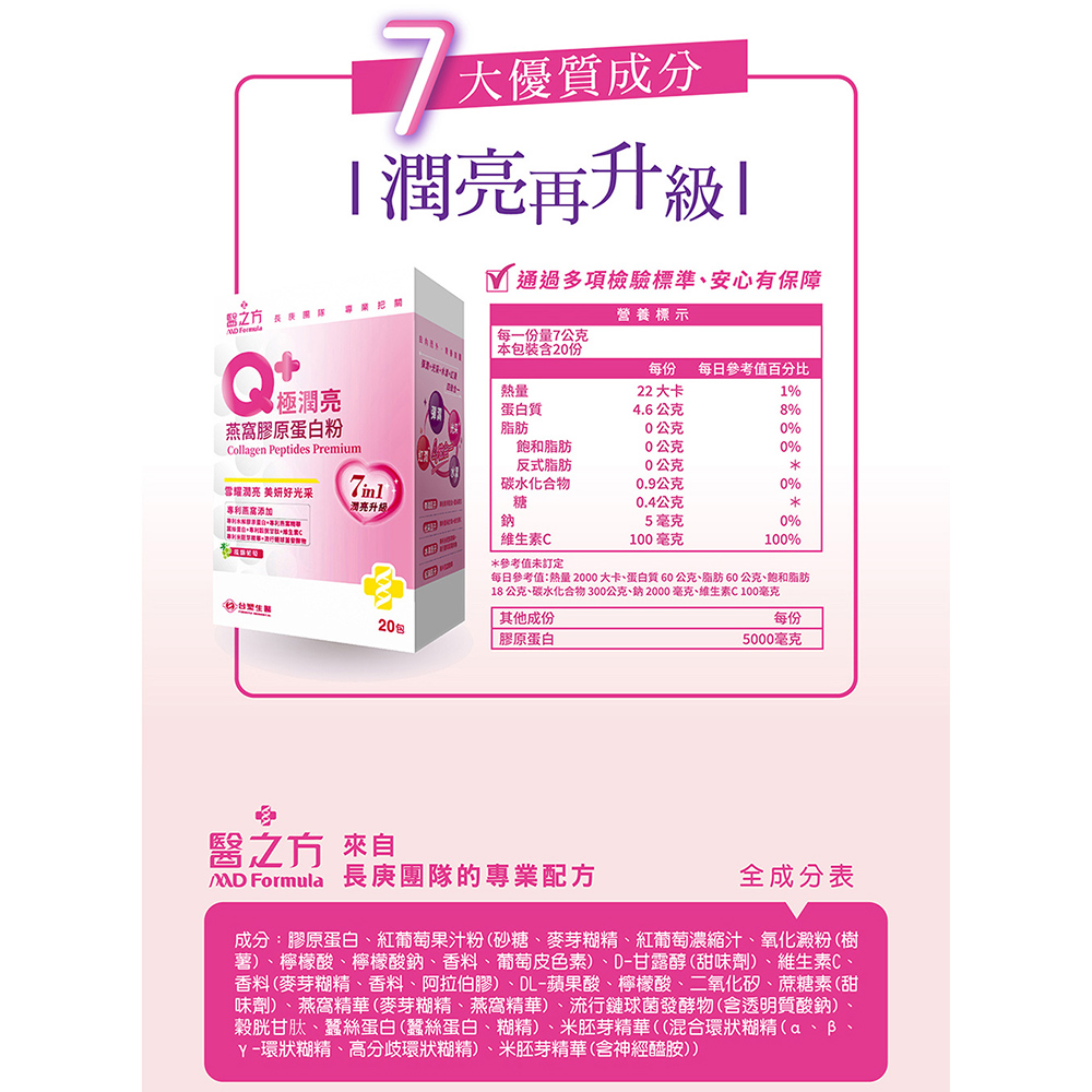 品 名:【台塑生醫】Q+極潤亮燕窩膠原蛋白粉(20包/盒) 1盒/2盒/3盒/5盒組