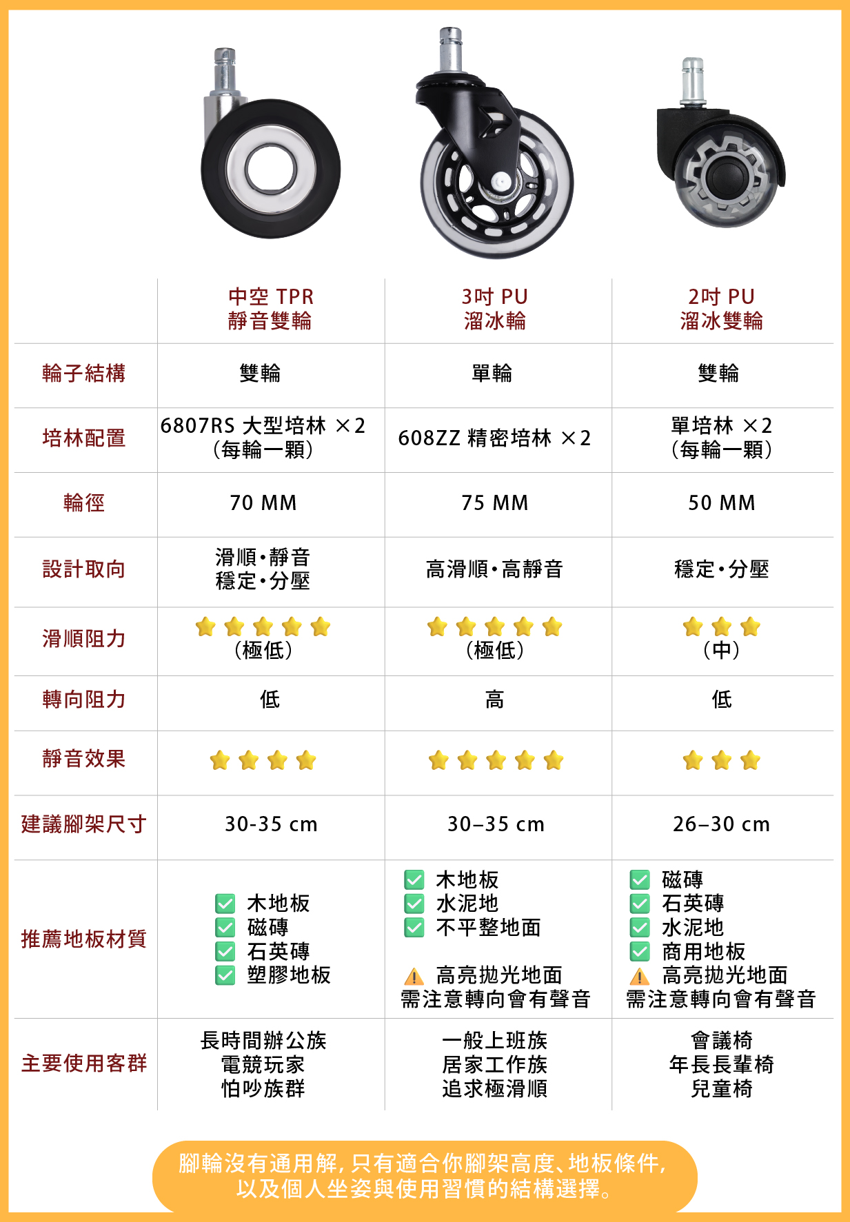 ✅ PU 靜音輪面:降低噪音、不刮傷地板,居家辦公都合適