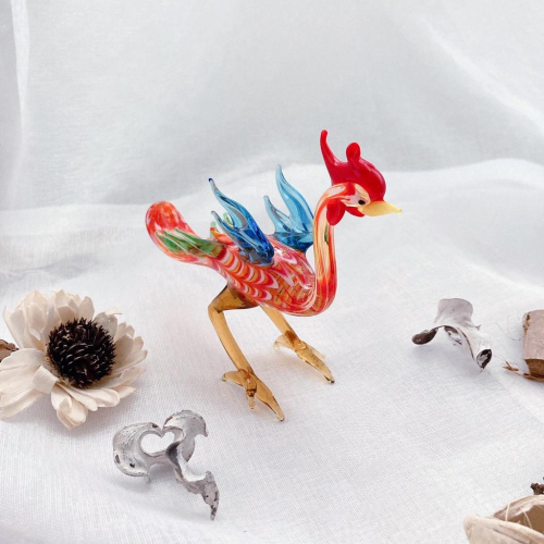 New 純手工燒製 絕美彩色花紋水晶玻璃 鳳凰 站姿 琉璃 擺飾